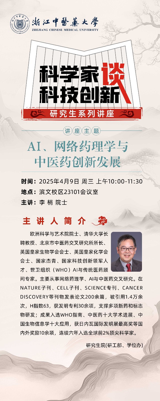 《科学家谈科技创新》研究生系列讲座预告——AI、网络药理学与中医药创新发展
